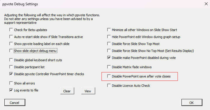 The second to last tick box says Disable PowerPoint save after vote closes. Ticking that box turns off the automatic saving and unticking it will turn it back on. Click OK once you have made the change.